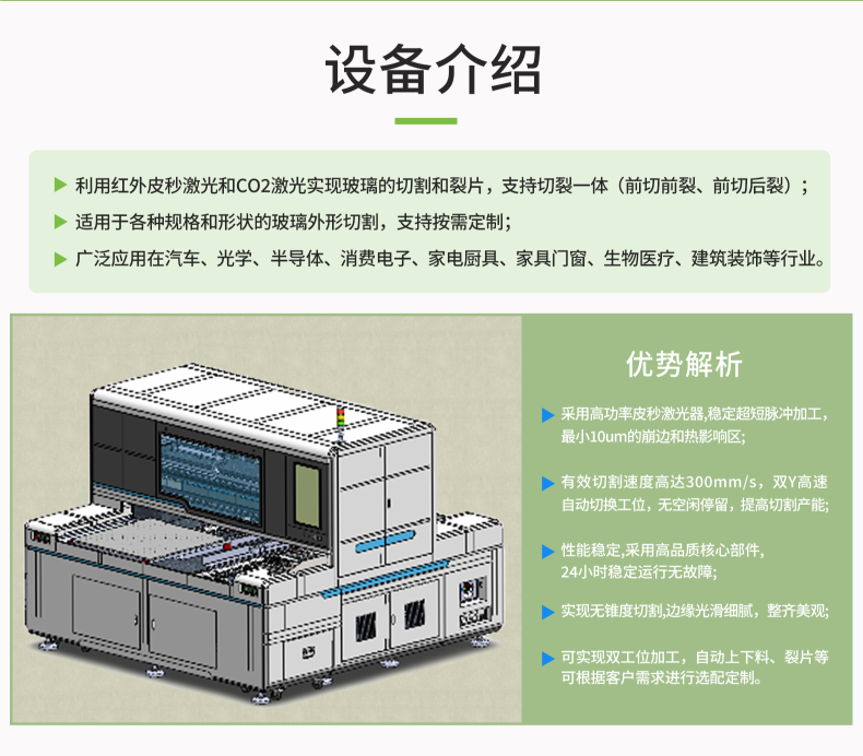 利用红外皮秒激光和CO2激光实现玻璃的切割和裂片,支持切裂一体(前切前裂、前切后裂);